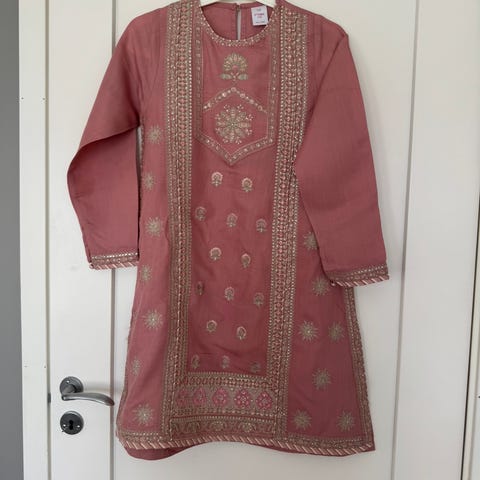 Selger veldig fin pakistanske sharara set med masse pynt og små speil. Peach farge. Følger med rubata også. Passer til 8-9 åring.