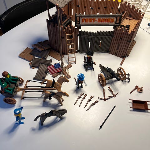 Playmobil riddersett med katapult og tilbehør. Inneholder blant annet to ridderfigurer, hester med avtagbar rustning, katapult, vogn, skjold, våpen, faner, pall og murdeler. Delene er i plast og har middelaldertema med våpenskjold og riddermotiv. Egnet som byggesett og rollelek med ridder- og borgmiljø.