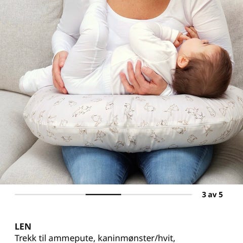 Ikea ammepute i U-form i hvit farge med trekk (kaninmønster). Trekket har glidelåsåpning, slik at det kan tas av for lufting eller vask etter behov. Puten gir støtte til mor og barn under amming eller flaskemating.
