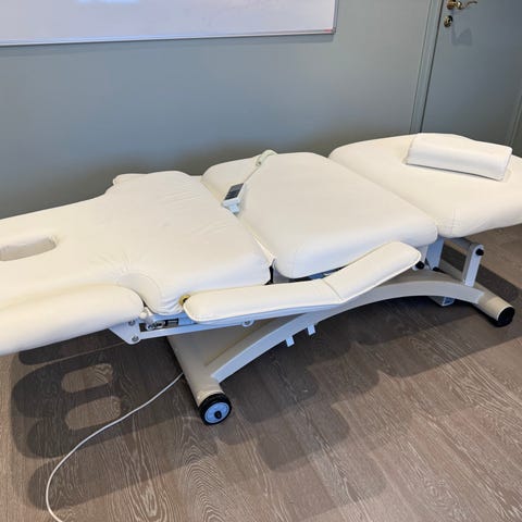Behandlingsbenk med polstret liggeflate i blått kunstskinn. Benken har ansiktsåpning og utskåret parti for hodestøtte, tilpasset behandling i mageleie. Understell i metall med regulerbare seksjoner for tilpasning av pasientens posisjon. Egnet til bruk i for eksempel fysioterapi, massasje eller annen klinisk behandling der pasienten ligger på benk. Det følger også med en matchende, høydejusterbar krakk med hjul. Perfekt til bruk hjemme også . Må hentes på Hønefoss . Ta kontakt 92889358