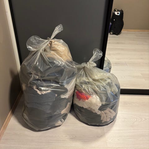 Selger en stor klespakke til dame. Klespakken inneholder t-skjorter, topper, gensere, jeans, boblejakke, kåpe, sommerjakke osv. Alle plaggene er brukt men pent brukt. Mye er i størrelse L (hverfall buksene og jeans).