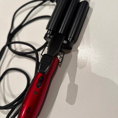 OBH Nordica bølgetang og håndtak i rød farge. Enheten har elektrisk ledning med vanlig støpsel for bruk i stikkontakt. Utformet for styling av hår med bølger eller krøller. Passer til generell hårstyling hjemme. Pent og lite brukt