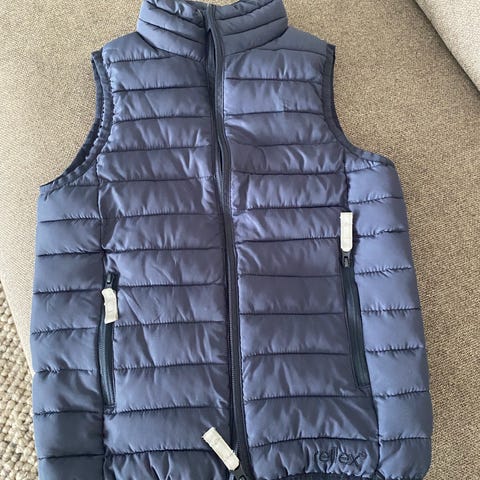 Fin vest i blå og hvit med glidelås i størrelse 12 mnd (tilsvarer størrelse 74 eller 80 tror jeg) fra Carter’s. Ubrukt fordi den ikke passet sønnen min i riktig sesong