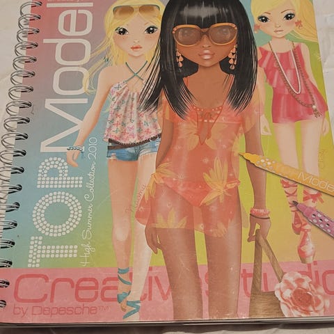 Top Model tegnebøker sett. Inneholder to ulike tegnebøker med spiralinnbinding og motiv av Top Model-figurer på omslaget. Bøkene har ferdigtrykte figurer og tomme sider til å tegne og designe klær og tilbehør. Egnet for barn som liker å tegne, fargelegge og lage egne motedesign. Lager også musikk ved å trykke på knappen.