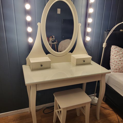 Sminkebord med LED-belysning og mye oppbevaringsplass. Speilet er omgitt av 12 LED-pærer, der den ene ikke lyser, så pære må byttes ut. Den er lite brukt, og har nesten ingen bruksmerker. Selges da den ikke blir brukt.