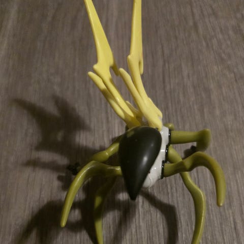 Plastleke utformet som et stort insekt. Figuren har grønn kropp med blå overdel og gule detaljer. Flere bein og antenner er bevegelige. Egnet som lekeinsekt til barn eller som rekvisitt i lek og aktiviteter der man trenger en insektfigur i plast.Dette er en leketøysfigur av karakteren Master Mantis (Mester Modliszka) fra DreamWorks-filmen Kung Fu Panda.