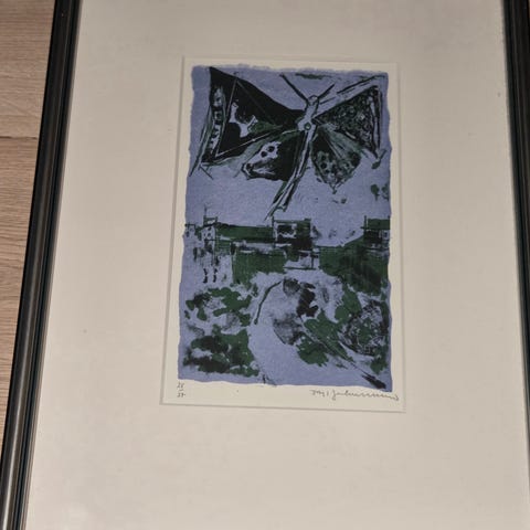 Trykket er kunstnerens eget trykk (EA / artist proof), nummerert 9/15, signert med initialene HJH, og gitt som personlig gave ved en 60-årsdag. Dedikasjonen er en del av verkets historie og proveniens.
