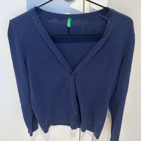 Selger en klassisk marineblå cardigan fra United Colors of Benetton i størrelse M.