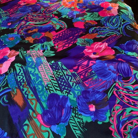 Blomstret stoff metervare i rød bunnfarge med beige blomster- og bladmotiv. Stoffet egner seg til sømprosjekter som klær, quilting, putetrekk, duker, løpere eller andre interiørdetaljer. Mønsteret er tett og jevnt fordelt over hele stoffet.