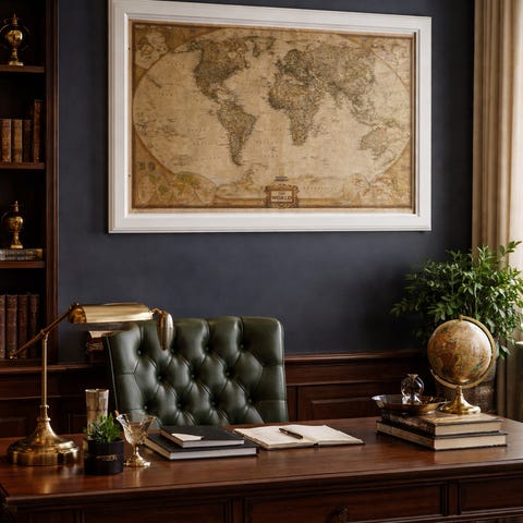 Veggkart verden som viser «The Continents of the World 1881». Kartet er innrammet i en enkel ramme med glassfront. Passer som veggdekor i stue, kontor eller arbeidsrom. Kartet viser verdensdelene med farger og engelske stedsnavn, og gir et historisk preg på innredningen.
