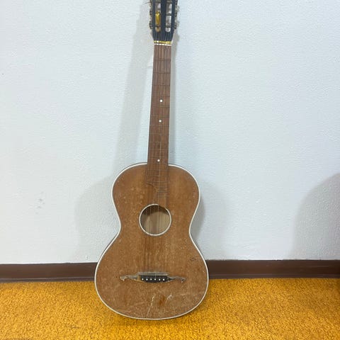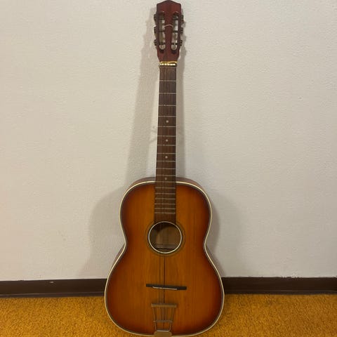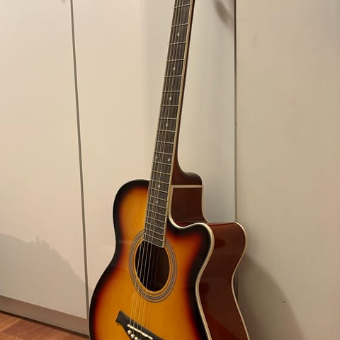Akustisk gitar i naturfarget treverk. Kroppen har lys topp og mørkere sider og bakside. Gitaren har seks strenger, båndmarkeringer på gripebrettet og mekaniske stemmeskruer på hodet. Passer til generell bruk som øving, akkompagnement og enkel spilling hjemme eller på øving. Egner seg for både nybegynnere og viderekomne som ønsker en standard akustisk gitar uten elektronikk.