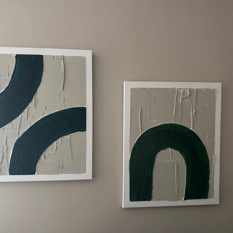 Abstrakt maleri med geometriske og organiske former i beige, grå og rustrøde toner. Bildet er innrammet i en lys ramme. Motiv og farger passer til nøytrale og moderne interiører. Egnet som veggdekor i stue, gang eller soverom. Ukjent kunstner og modellnavn.