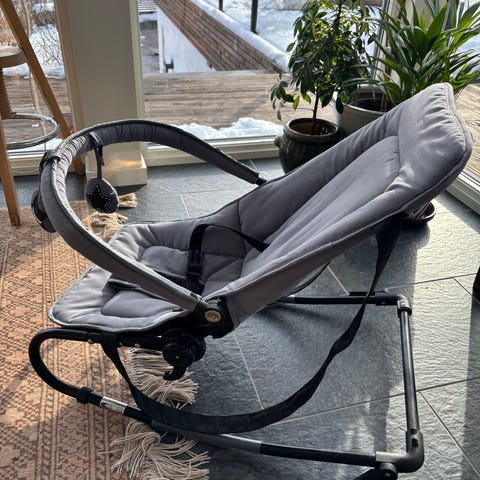 Fin reiseseng som knapt er brukt. Kan brukes som sto og kan justeres i høyde og vinkel. Med stropper for å sette fast barnet.