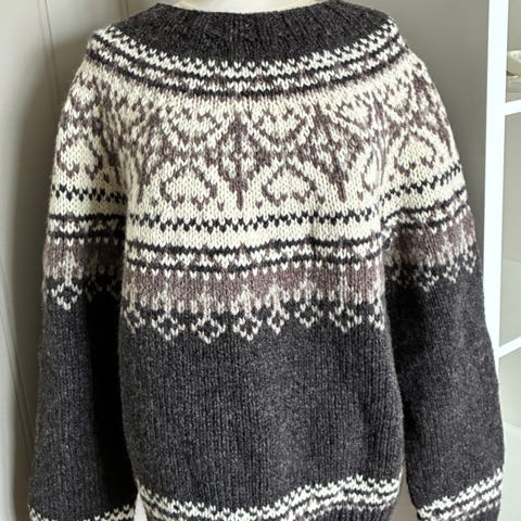 Hjemmestrikket Islender ullgenser. Størrelse M («modellen» på bilde er 178 cm. Mellomhøy hals. Fin og varm, nesten ikke brukt.