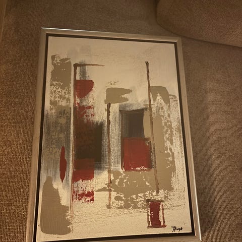 Abstrakt maleri med lyse og beige toner samt innslag av rødt, innrammet i enkel ramme. Motiv med geometriske og organiske former i et moderne, non-figurativt uttrykk. Passer som veggdekor i stue, gang eller soverom. Størrelse er ikke oppgitt og bør eventuelt måles ved interesse.