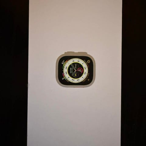 Apple Watch Ultra smartklokke i titan med nylonrem. Klokken har rektangulær skjerm med digital krone og ekstra funksjonsknapp på siden. Bakside med optiske sensorer for pulsmåling og annen helserelatert registrering. Leveres med justerbar nylonrem som festes med borrelås. Egnet til daglig bruk, aktivitetssporing og varsler når den er koblet til kompatibel iPhone.