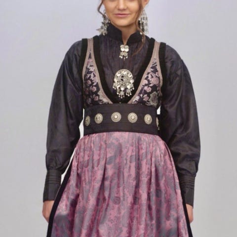 Str ca 44-46 høyde 165 leies ut med skjorte , sjal, belte , forkle, hårvippe.