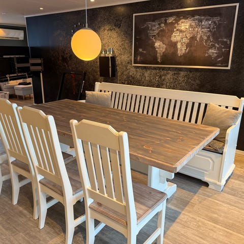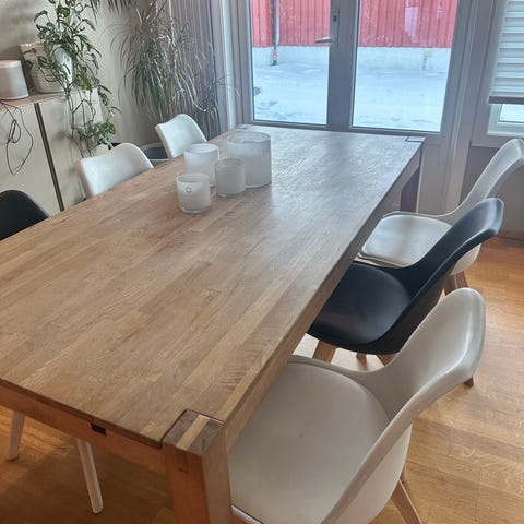 Pent bord med 6 stoler. Bordet er 200cm langt pluss 2 plater på 40cm. (Krakk følger ikke med!)