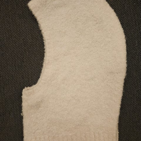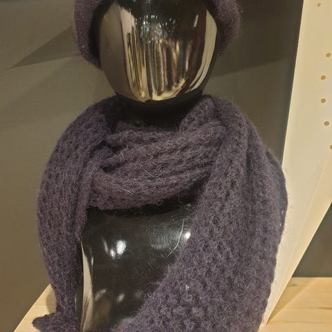 50% ull 20% mohair. Fin og myk, lite brukt.