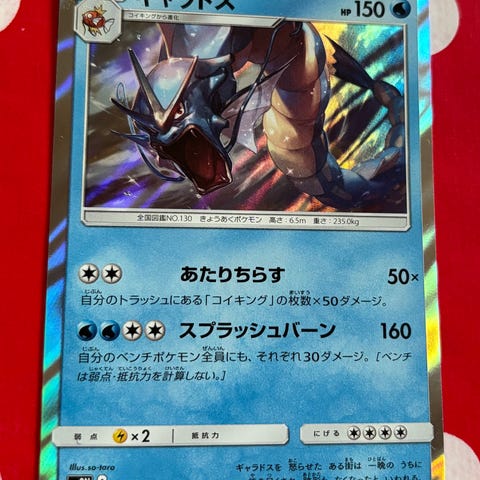 Pokémon Gyarados Base Set samlekort. Originalt Pokémon-kort med Gyarados-figur fra Base Set-serien. Kortet er på engelsk og viser Gyarados som vann-type Pokémon med angrepene Dragon Rage og Bubblebeam. Standard størrelse Pokémon TCG-spillkort, egnet både til samling og spill i Pokémon Trading Card Game.
