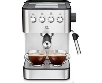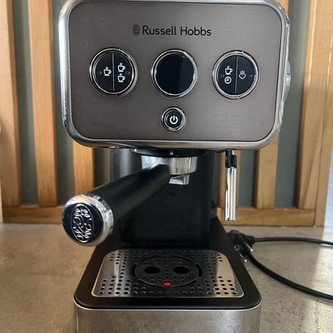 Russell Hobbs espressomaskin for tilberedning av espresso og andre kaffedrikker. Maskinen har frontpanel med flere betjeningsknapper og manuell bryter for å starte og stoppe bryggingen. Utstyrt med portafilter og to tuter for brygging av én eller to kopper samtidig. Egnet for bruk på kjøkkenbenk til daglig kaffebrygging i hjemmet.