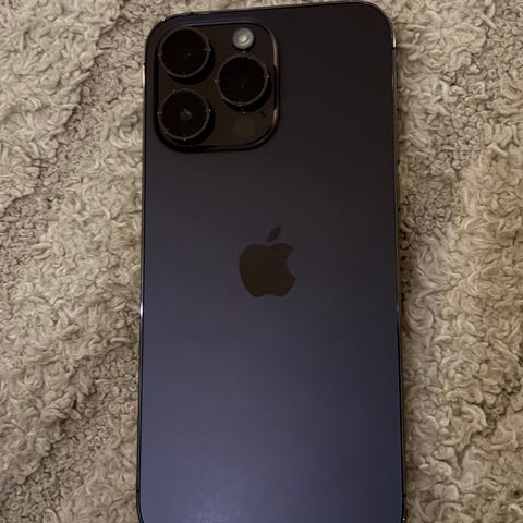 Apple iPhone 14 Pro Max mobiltelefon med 128 GB lagringskapasitet. Det er synlige sprekker på bakdekselet, Bluetooth fungerer ikke på telefonen, batteriet er på 85 % kapasitet, jeg gir også bort beskyttelsesbriller og 2 etuier i settet.