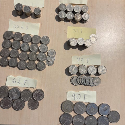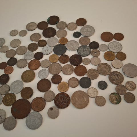 Samlingslot med utenlandske mynter fra ulike land og årganger. Bildene viser blant annet franske, britiske og andre europeiske mynter i forskjellige valører som franc, shilling, pence og centimos. Årstall som kan leses på lappene inkluderer blant annet 1902, 1936, 1943, 1949, 1951, 1956, 1959, 1962, 1971 og 1994. Myntene har varierende størrelse, metall og preg, og egner seg som supplement til en myntsamling eller for sortering etter land, valør og årstall. Det anbefales å studere bildene nøye for oversikt over hvilke mynter som følger med i lotten.