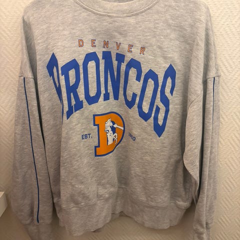 H&M collegegenser for dame i størrelse L. Genseren er hvit og laget av bomull. Den har rund hals, ribbekanter og trykk med «Las Vegas Raiders» foran. Passer som en casual genser til hverdagsbruk.