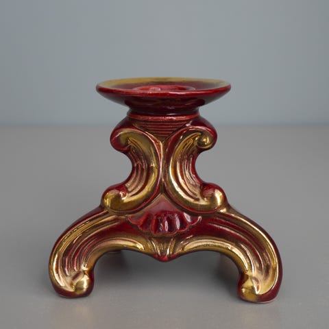 vintage lysestake, retro interiør, 70-tall dekor, rosa porselen, marmorert glasur, gullkant, borddekor, små lysestaker, samleobjekt retro