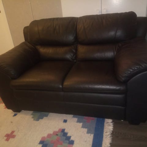 2-seter sofa i beige skinn. Sofaen har buede armlener og polstret rygg med to sitteputer. Passer til stue, TV-stue eller mindre oppholdsrom der det er behov for en kompakt sitteplass. Nøytral farge som er lett å kombinere med annet interiør. Må hentes.