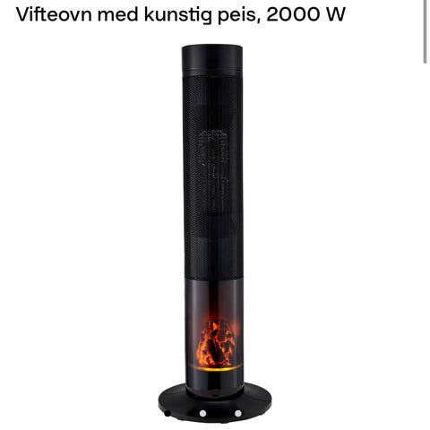 Vifteovn med kunstig peis på 2000 W. Frittstående søyleovn i svart utførelse med integrert dekorflamme som gir peis-effekt. Egnet som tilleggsvarme i rom der man ønsker både varme og visuell flammeeffekt. Elektrisk drift med vifte som fordeler varmen i rommet.