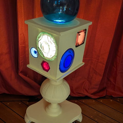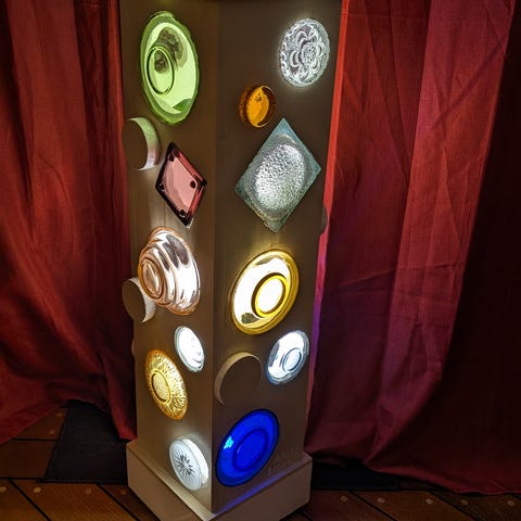 AMAG Dekorlampe er laget av limtre og klare/fargede glass objekter. Hvert objekt er limt i en frest fordypning. En spesiell, kreativ og fargerik lampe hvor kun denne finnes. LED pære 7,2W holder 3 år (30.000 timer) ved kontinuerlig bruk. Og kan dimmes hvis du syntes den lyser for mye. Høyde 110 cm og 22,5 x 22,5 i firkant. Kassen og foten kan selvsagt males i ønsket farge.