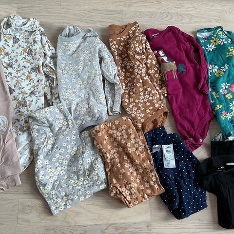 Fin klespakke med 7 plagg. 2 x tightser, kjole, 2 x genser, tunika (alt bomull) og hals i bambus.