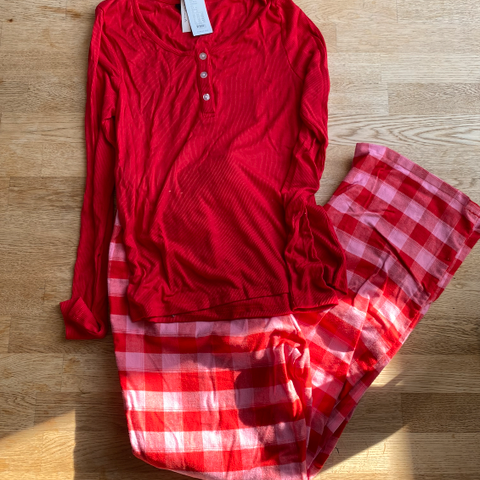 Change pysjamas for dame i størrelse L. Sett med skjorte og bukse i blå polyester med blank overflate. Skjorten har krage, knappelukking foran og brystlomme med brodert detalj. Buksen er lang og laget i samme materiale som overdelen. Egnet som nattøy eller loungewear.