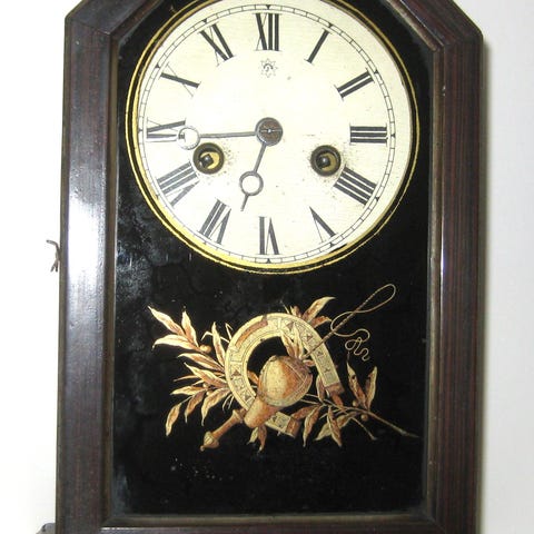 Veggur i tre med mekanisk urverk og opptrekksnøkkel. Klokken har buet trekasse i mørk finish og rund urskive med tydelige tall og visere. På baksiden er det luke som gir tilgang til urverket, pendel og opptrekksmekanisme. Egner seg som bord- eller hylleur i stue, gang eller andre oppholdsrom.Klokken trenger reparasjon