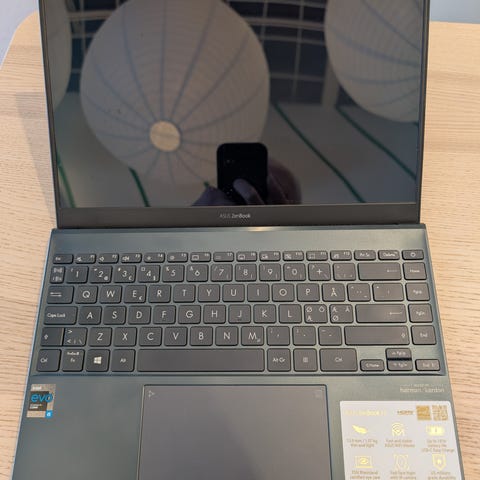 Asus Zenbook bærbar PC med 14-tommers OLED-skjerm. Maskinen er utstyrt med AMD Ryzen 7 5825U-prosessor med 8 kjerner og klokkefrekvens på 2 GHz (opptil 4,5 GHz turbo). Lagringskapasiteten er 1 TB SSD.