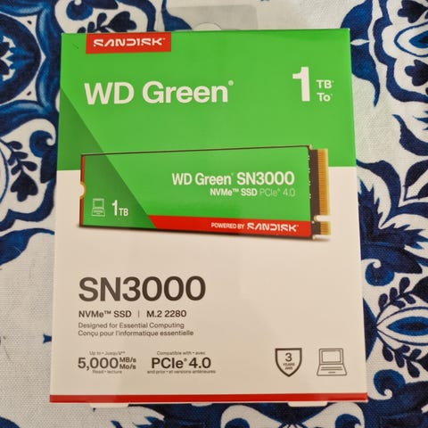 WD Blue SN5000 NVMe TLC SSD med lagringskapasitet på 1 TB. SSD-en bruker PCIe 4.0-grensesnitt og er i M.2-formfaktor. Egnet som intern lagringsenhet i kompatible stasjonære PC-er og bærbare PC-er som støtter NVMe M.2 PCIe 4.0 SSD.