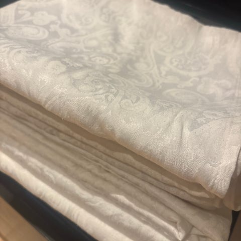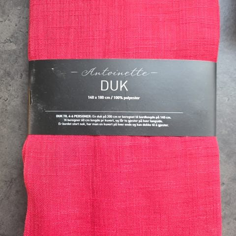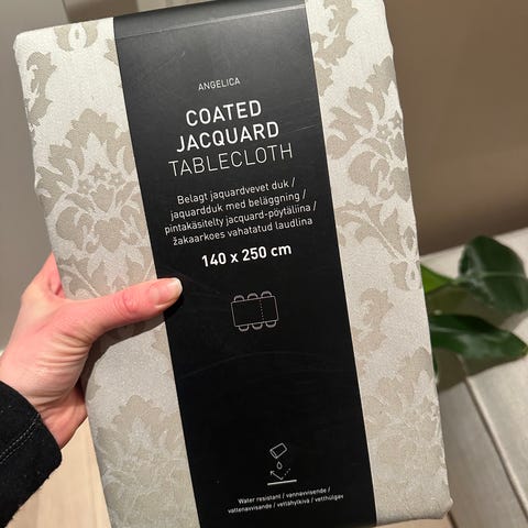 Kid duk med mønster i lyse, nøytrale toner. Duken har et gjennomgående ornamentmønster og dekorativ bord langs kantene. Passer til rektangulært spisebord. Egnet til bruk i spisestue eller kjøkken ved hverdagsbruk eller ved mer formelle anledninger.