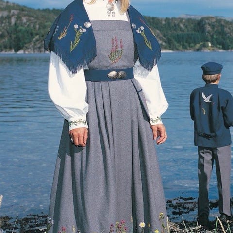 Kystdrakt med skjorte, stakk, sjal, cape, belte med bunadsveske, hårbånd og Gokstadsølv.