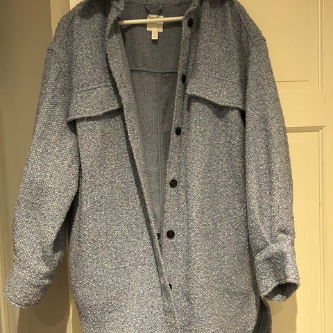 H&M jakke for dame i størrelse M. Jakken er grønn og laget i polyester. Modellen har rund hals, lange ermer og knappelukking foran med dekorative knapper. Foran er det to små brystlommer med klaff og to lommer nederst, også med klaffdetaljer. Strikken har en strukturert overflate, og jakken har en rett, kortere passform som går til omtrent hoftehøyde. Passer til hverdagsbruk eller som et lett lag over topp eller kjole.