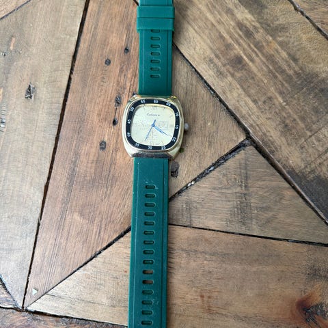 Fin forsining mekanisk herreklokke med gullfarget metalllenke og svart urskive. Klokken har analog visning med markerte timemarkører og flere små urskiver på skiven. Urkassen og lenken er i metall med foldespenne. Baksiden av urkassen er merket med «stainless steel back» og «water resistant». Passer som armbåndsur til herre i hverdags- og penbruk. Kommer med eske. Dagsvisning, datovisning og sekundviser i de små komplikasjoner.