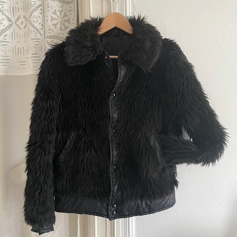 Flott fuskepelsjakke i A-fasong. Design: Carolyn Wright Freeman. Den er helfóret og merket med størrelsen L, men passer bedre som XL. Jakken ble kjøpt i London på 1990-tallet, men har siden hengt i en klespose til oppbevaring, og er derfor som ny. Farge: Den er dyp mosegrønn, har brede, elegante skuldre og ermer med oppbrett. A-fasongen gir volum til stoffet og et nydelig fall, spesielt bak på ryggen. Jakken kan sendes. Kostet 4000 kr ny, men selges for kr. 1600.