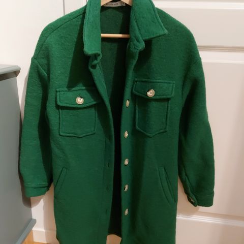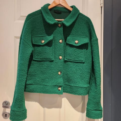 Kort Pepper jakke for dame i størrelse S. Jakken er sterk grønn og laget i polyester og Lana. Modellen har krage, knapper i front og to store påsydde lommer foran. Mansjettene har knappelukking. Passer som en kort, lett jakke til hverdagsbruk. Det er en litt oversize type. Rett fasong . Lengde fra nakken og ned ca 55 cm
