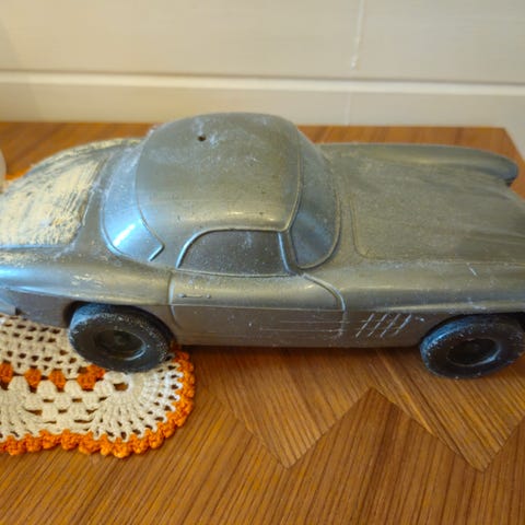 Gammel lekebil i godt brukt tilstand. Fra 60 tallet. 25 cm lang, plast. Hbo 200 kr