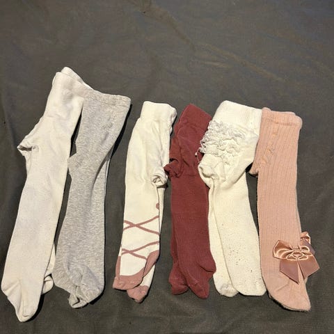 4 strømpebukser str62-68. Nr3 fra venstre er ull og har to mørke flekker som ikke går bort, ellers ingen synlige flekker.