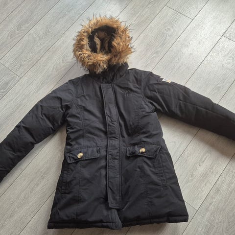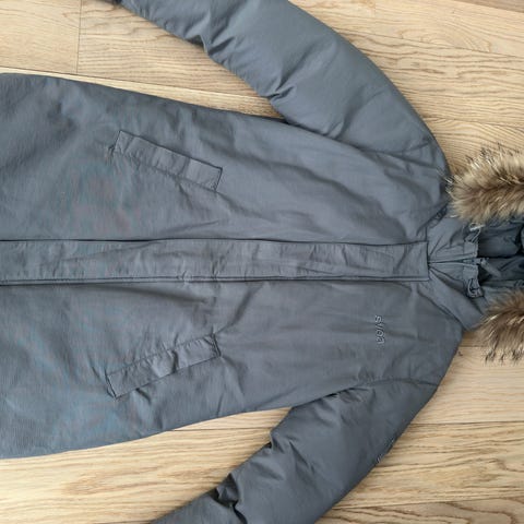 Fin skinnkrage, lukkes med glidelås og trykknapper. Mansjett med strikk. To gode lommer med trykknapp og to ovenfor med glidelås. Grå-svart i farge
