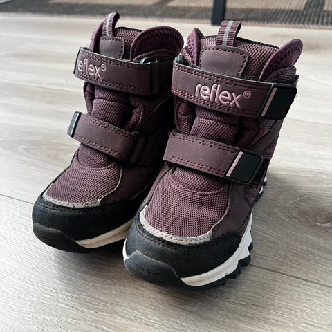 Reflex vintersko for barn, jente, i størrelse 25. Skoene har overdel i tekstil og syntetisk materiale i burgunder og svart, med borrelåslukking over vristen for enkel av- og påkledning. Grovmønstret yttersåle gir godt grep på underlaget.