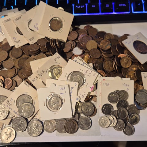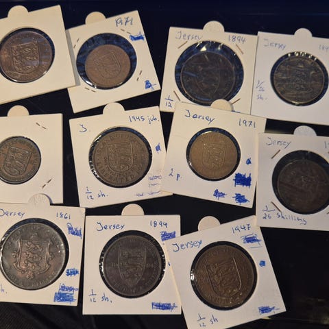 Totalt 16 mynter, der de fleste har tydelige årstall og detaljer.