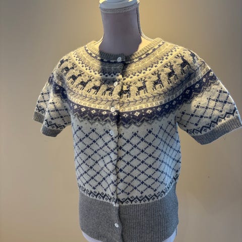 Hjemmestrikket ull vest. Varm og tykk. Fine detaljer ved skuldre. Hemper øverst, ingen andre knapper. Litt utsvingt . Lengde fra bake og ned ca 46 cm.