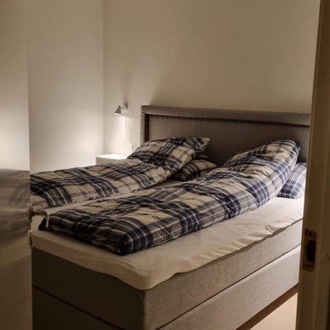 Pent brukt kontinentalseng. Trekk på overmadrass og seng er vaskbart. Meget behagelig Svane seng.